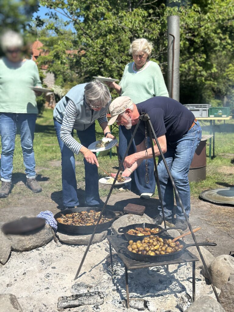 Aus unserem gesammelten wilden Zeug und Biogemüse aus der Region kreieren wir gemeinsam wilde vegetarische und vegane Leckereien, wie z.B. Wildkräutersalate, Pestos, Brote, Eintöpfe. Wir brutzeln am offenen Feuer und experimentieren mit verschiedenen Back- und Garmethoden, wie z.B. Fladen vom heißen Stein, Erdbackofen, Gemüse im Feuertopf, Brot backen in der Glut und im Dutchoven. Auch wird es einmal fisch vom Feuer geben. Am knisternden Feuer und unter freiem Himmel genießen wir gemeinsam unsere wilden Mahlzeiten. Samstag machen wir ein Erntedank Ritual am Feuer. Sonntag geht es speziell um den Geist der Pflanzen.